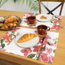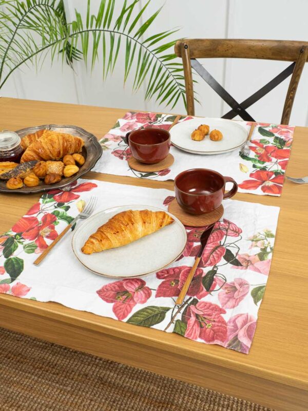 Bright Climbing Flowers linen placemats depicting flowering bougainvillaea and clematis will infuse your table setting with summer vibrancy and joy!