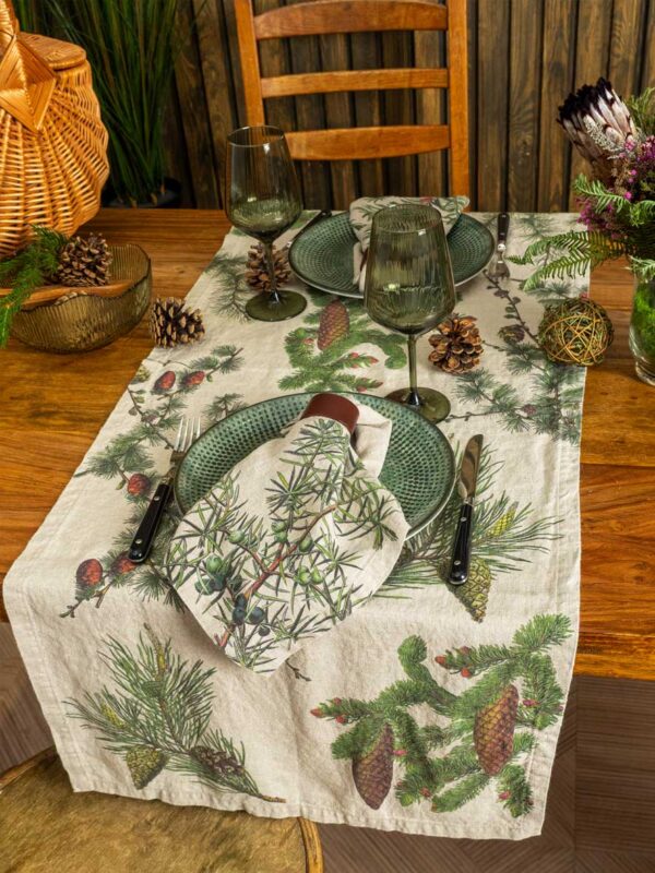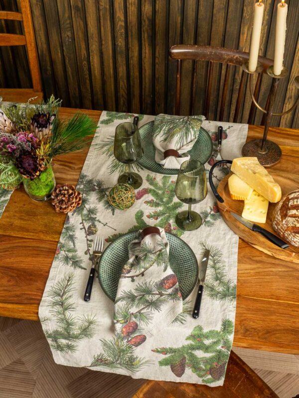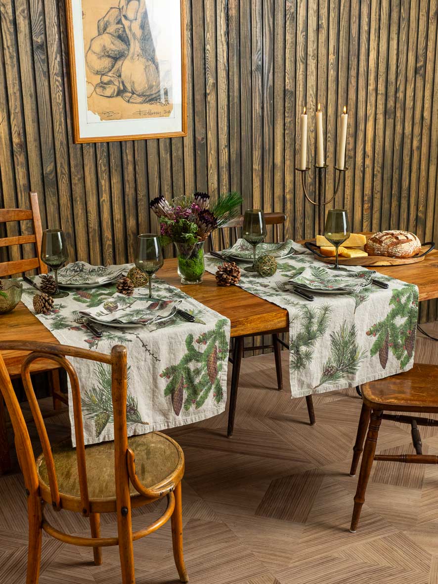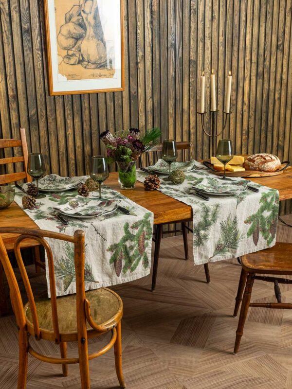 Beautiful linen table runner Shady Conifers will set your dinner straight into a rustling forest, surrounding you and your guests with pine branches, spruce cones, and layered shades of green. Perfect for country houses, mountain chalets, or even an urban dining room seeking to create a magical woodland-inspired holiday atmosphere.