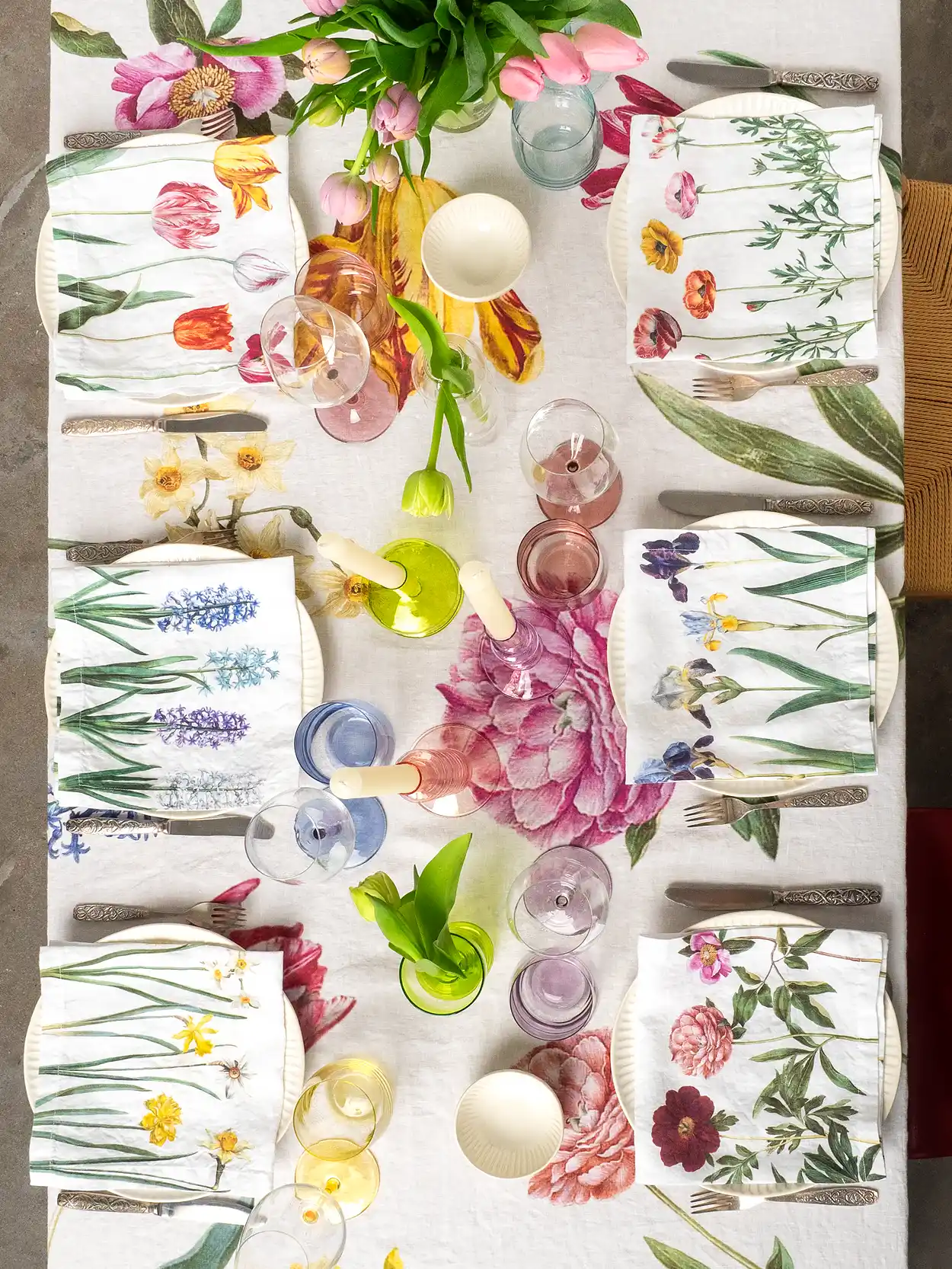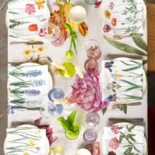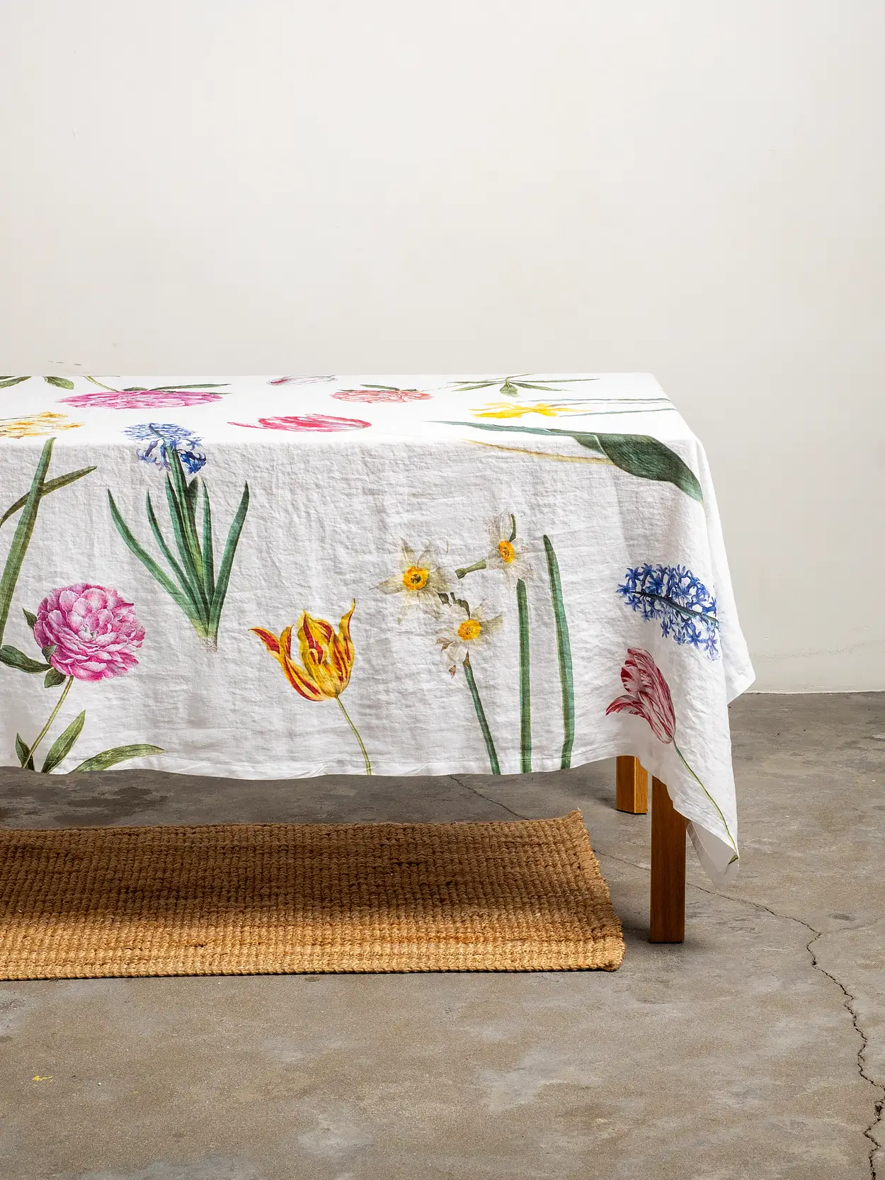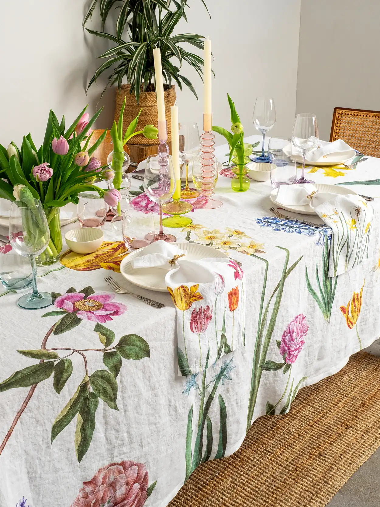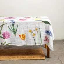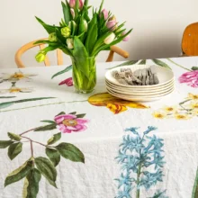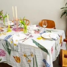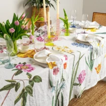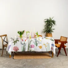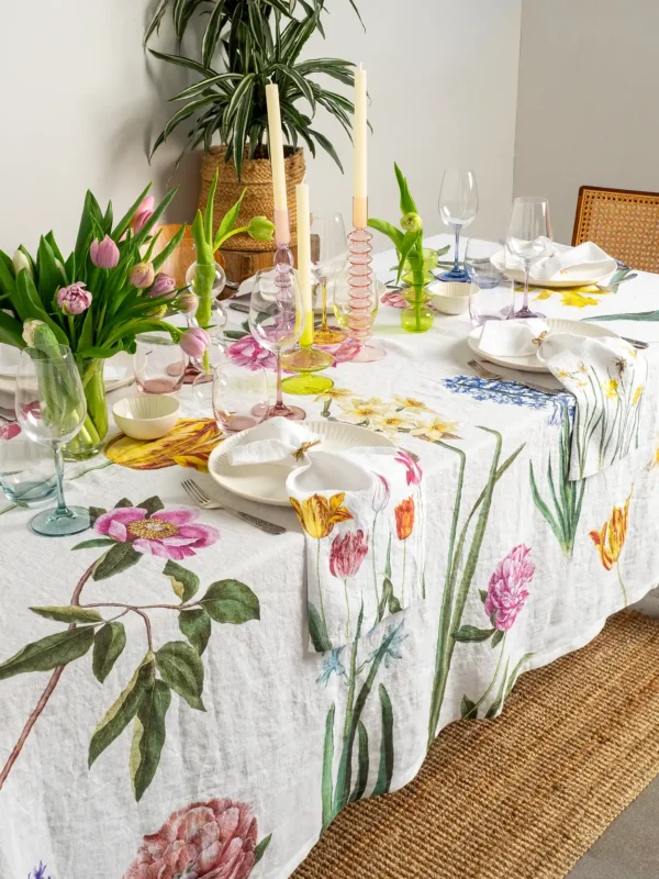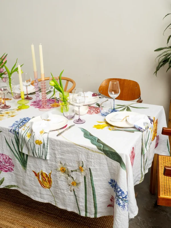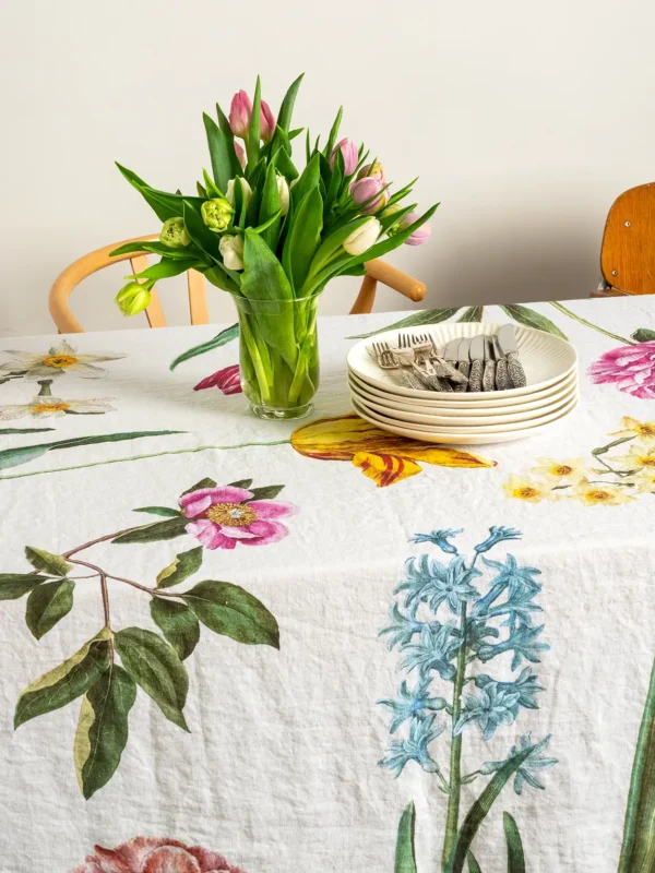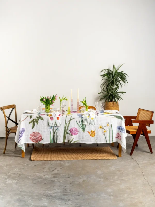 The Early Flowers linen tablecloth brings the freshness of spring to your dining room, filling your table with colorful blooms. Tulips, daffodils, hyacinths, and peonies, elegantly scattered across a white linen background, create a magical atmosphere—turning any meal into a festive feast. Perfect for joyful family lunches or special occasions.