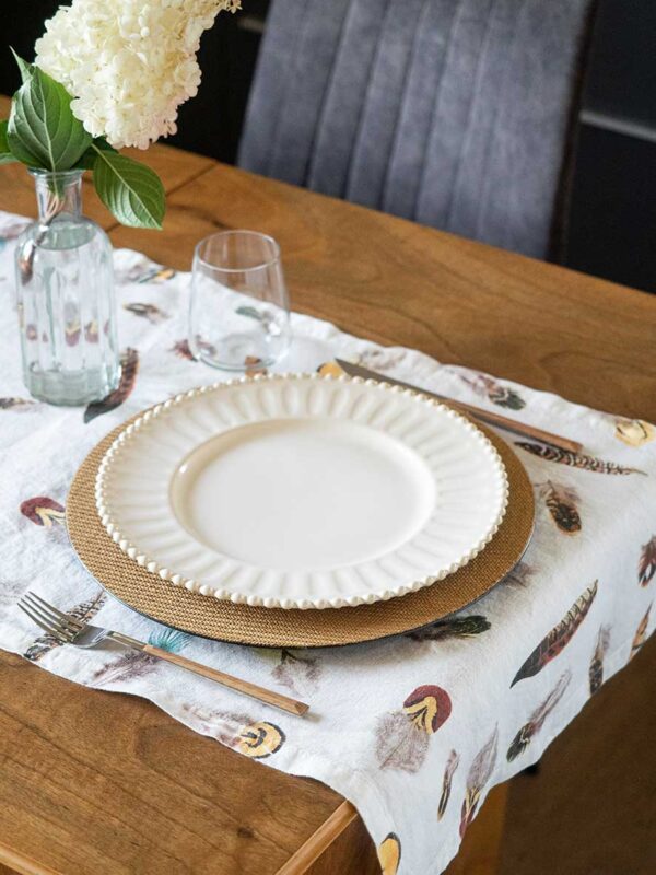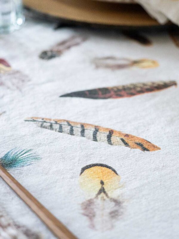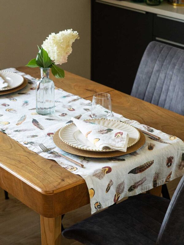 Light and dreamy Feathers table runner will bring warmth and cosiness to your dining table. Soft off-white colour linen and lovely feathers prints in warm tonalities will create a comforting atmosphere for friendly reunions around the table. It’s a superb gift idea!