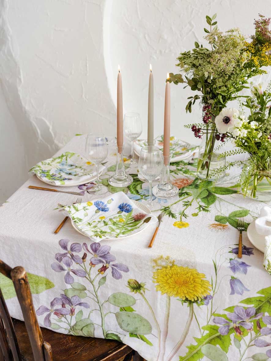 The Field Flowers linen tablecloth brings the breeze of blooming meadows to your table. Dandelions, clover, anemones, and fresh green foliage, delicately scattered across a crisp white linen background, create a light and joyful atmosphere in the dining room. Perfect for summer lunches, dinners with friends, or special moments with your family.