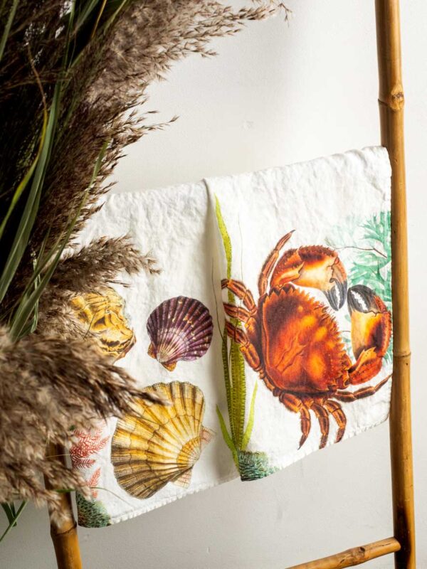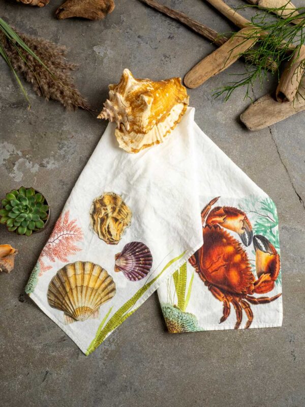 The Crab and Oysters linen kitchen towels bring the essence of the ocean right into your kitchen. With vibrant, lifelike designs, they add a coastal touch to your space and create a seaside-inspired atmosphere. Perfect for serving gourmet meals or adding a nautical flair to your dining experience.