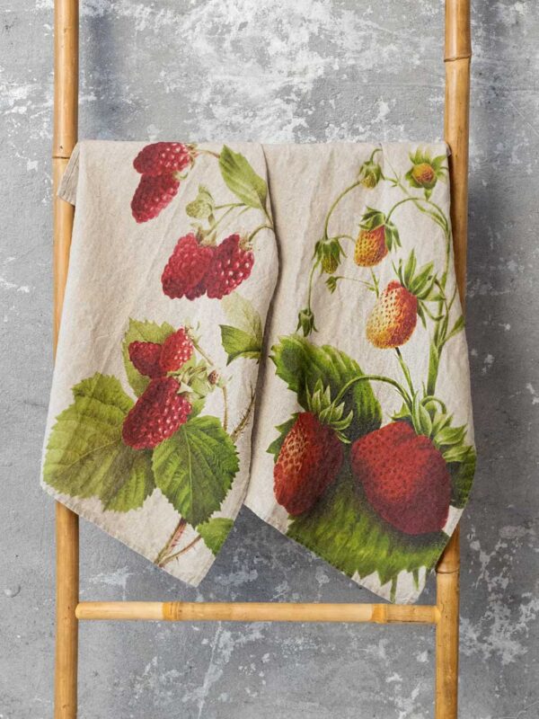 Tasty-looking linen kitchen towels Strawberry and Raspberry are a nice accent to farmhouse-inspired kitchens and a nice gift for talented cooks!