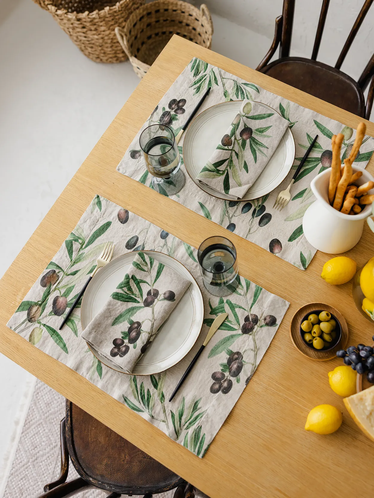 Delightful set of linen Olives design provencal placemats will add a touch of Mediterranean vacation to your table. These crude linen colour place mats will look great in any dining room or kitchen. Our linen table mats are made from quality stone washed linen to meet highest expectations. It’s a superb host gift when visiting friends.