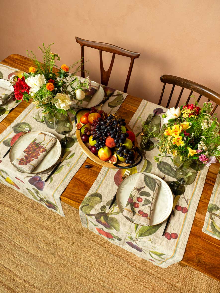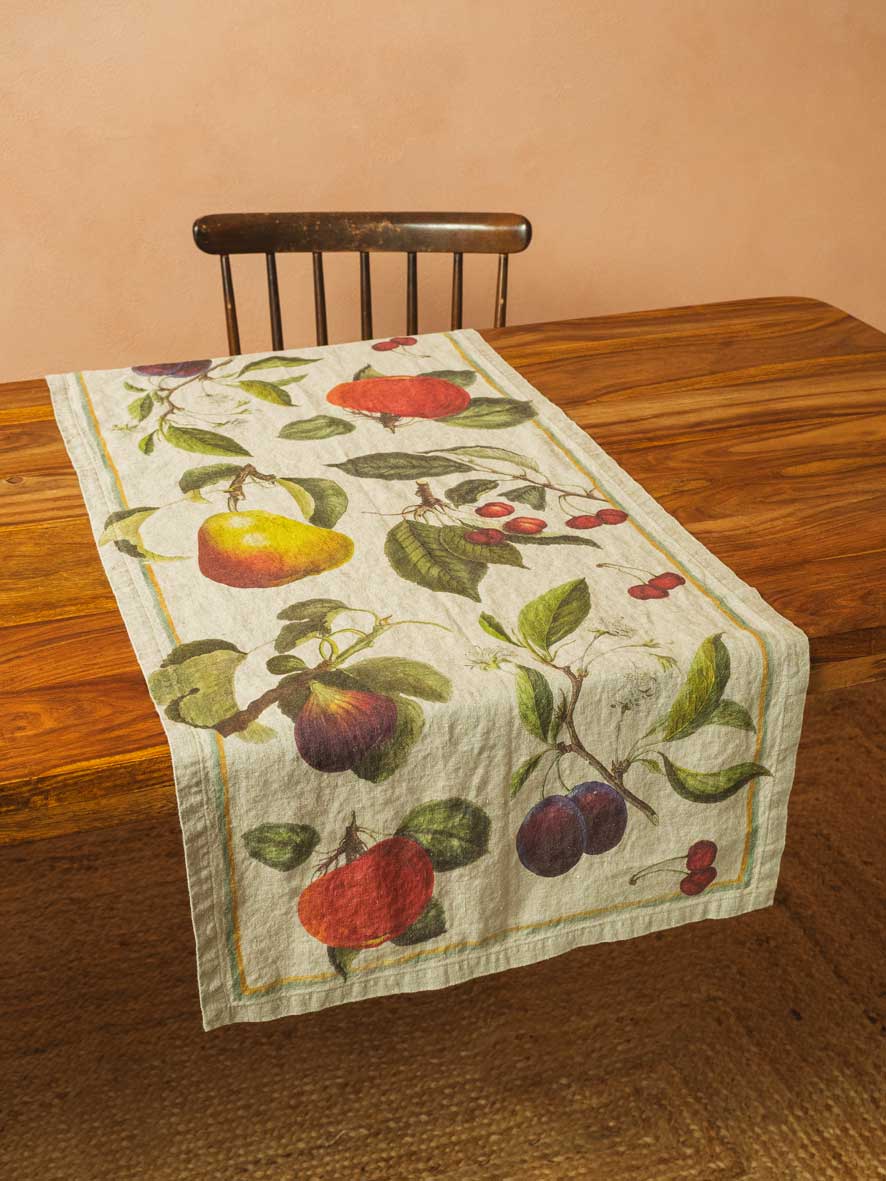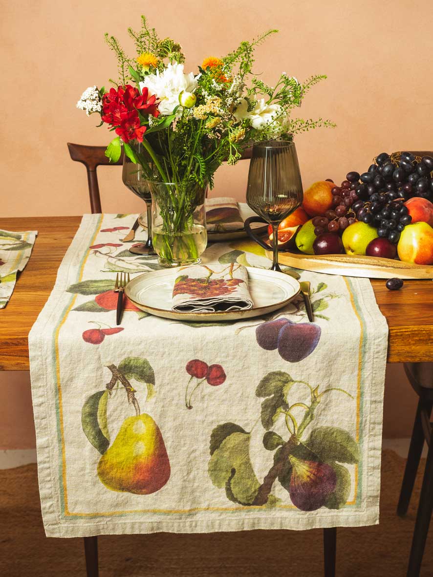 Orchard Fruits table runner will fill your table with the liveliness of a garden harvest. With apples, cherries, and plums scattered across soft linen, they bring warmth, abundance, and a touch of rustic charm to any table.