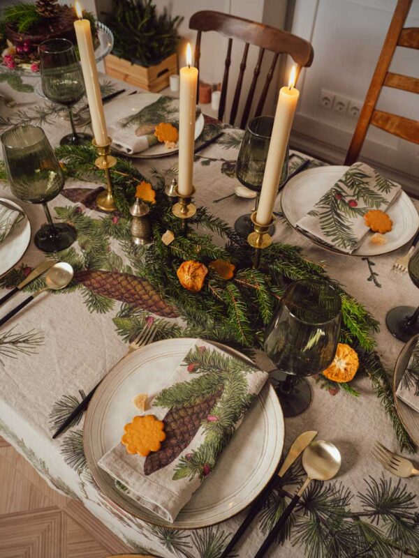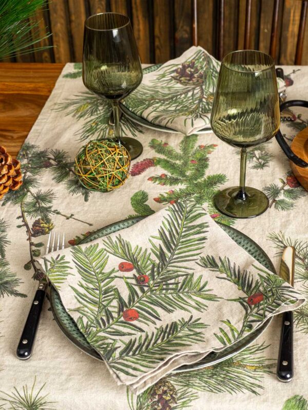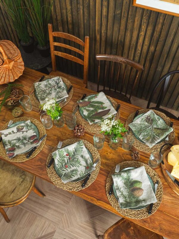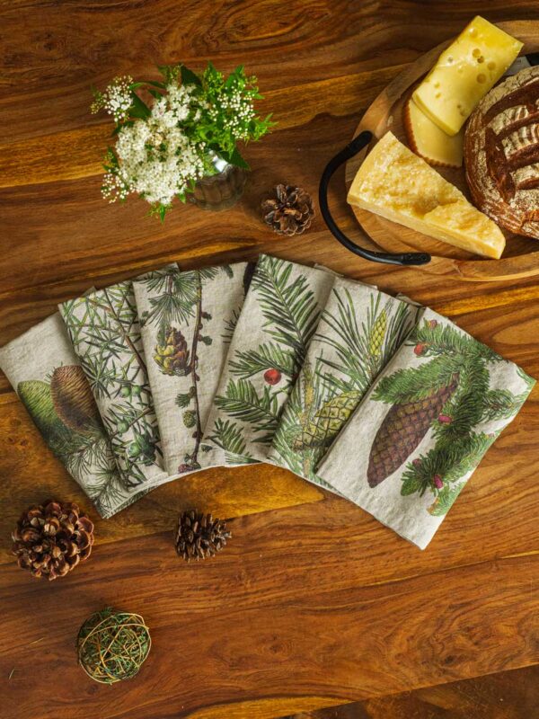 The lush green colour of CONIFER Trees linen napkins will bring tranquillity and freshness to your table. The LINOROOM brand uniqueness is that napkin sets are composed of 6 different designs, which makes any table setting exciting and leaves guests surprised to have their own personal serviette! The set includes 6 different designs of the most conifers.